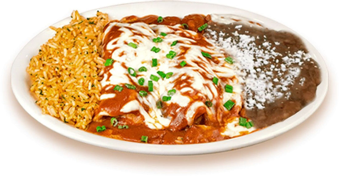 2 corn tortillas stuffed with shredded chicken, your one choice of our famous enchilada sauce: red mild, green spicy or green not spicy. With a blend of jack and cheddar cheese, mexican style rice, slow cooked & mildly spicy beans topped with cotija cheese. Garnished with chives.