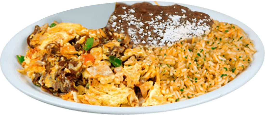 Shredded beef mixed with eggs, green bell pepper, onion blend, tomatoes, tortilla chips, slow cooked & mildly spicy beans with cotija cheese, mexican rice & tortillas.