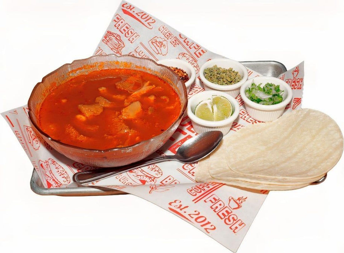 Delicious menudo. Includes cilantro, onions, crushed chili peppers, oregano and corn tortillas. Hominy available upon request.