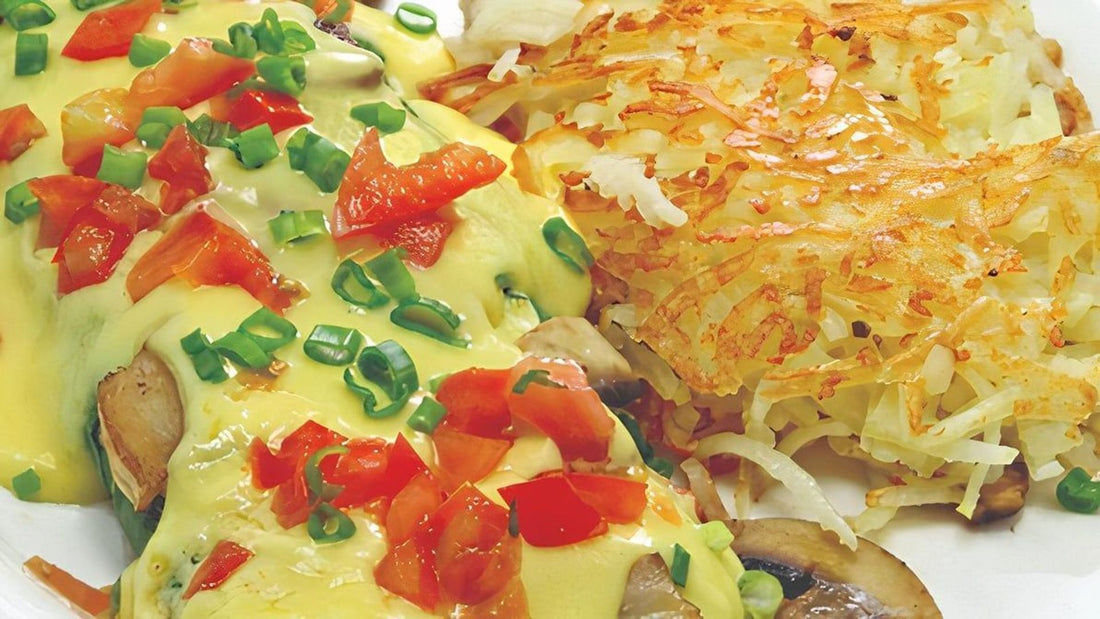 2 scrambled eggs mixed with green bell pepper & onions, spinach, swiss cheese, grilled mushrooms, covered with diced tomatoes & hollandaise sauce. Served with hashbrowns.