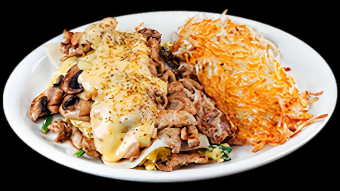 2 scrambled eggs mixed with green bell pepper & onions. Topped with spinach, swiss cheese, chicken breast strips, mushrooms & hollandaise sauce finished with seasoned salt. Served with hashbrowns.