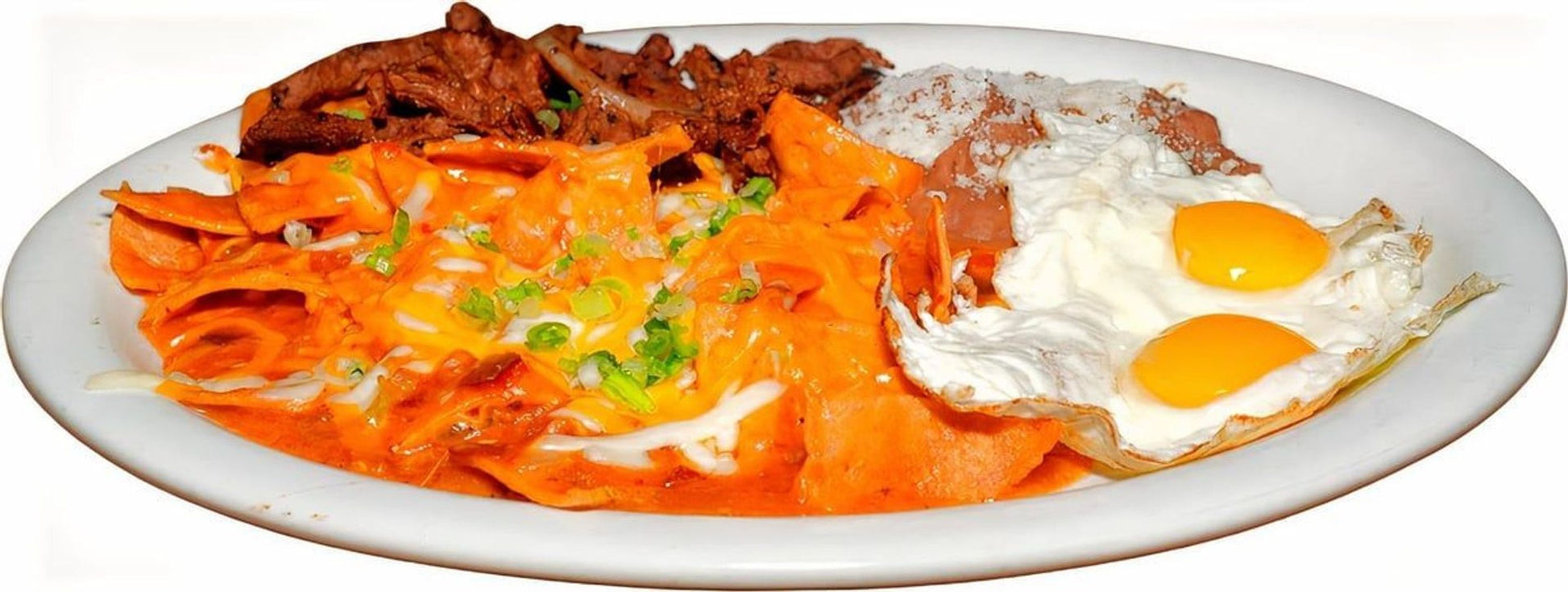 Marinated steak with sliced onions & freshly fried tortilla chips sauteéd in your one choice of our famous chilaquiles sauce: red spicy, red mild, green spicy or green not spicy. With a blend of jack and cheddar cheese with chives. Served with 2 eggs cooked any style, slow cooked & mildly spicy beans finished with cotija cheese.