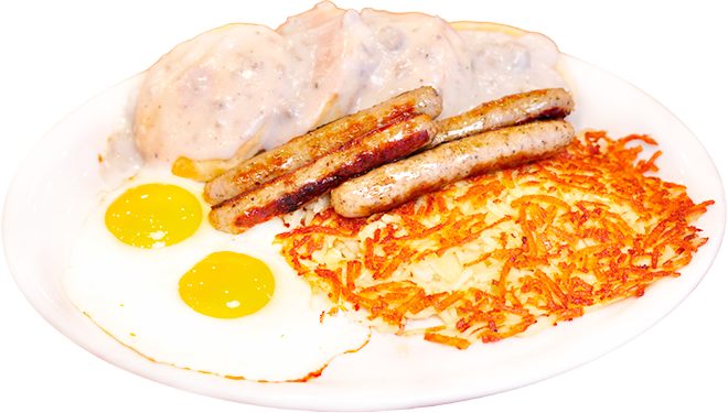 Fluffy biscuits topped with creamy sausage gravy, served as a side.