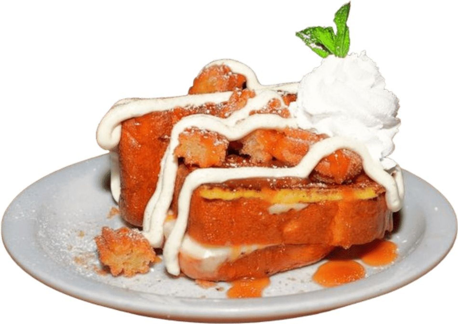2 slices of Brioche French Toast stuffed with our homemade sweet cream cheese and caramel drizzle. Topped with cinnamon sugar, powdered sugar, fresh whipped cream & a mint leaf.