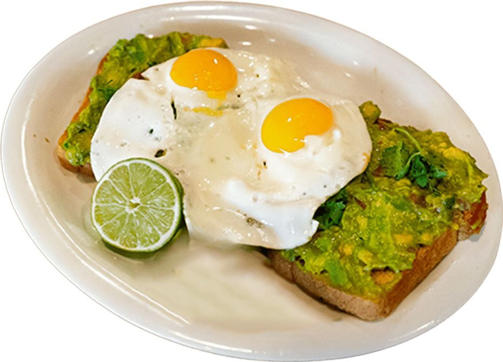2 Slices of whole wheat toast smothered with fresh mildly spicy guacamole. Topped with cilantro leaves & 2 eggs any style.