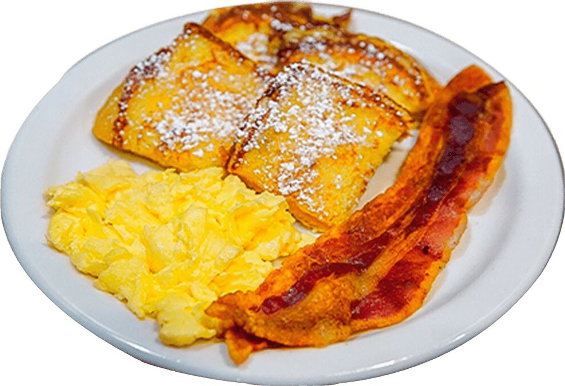 1 egg, 1 brioche french toast, 2 pork bacon strips.