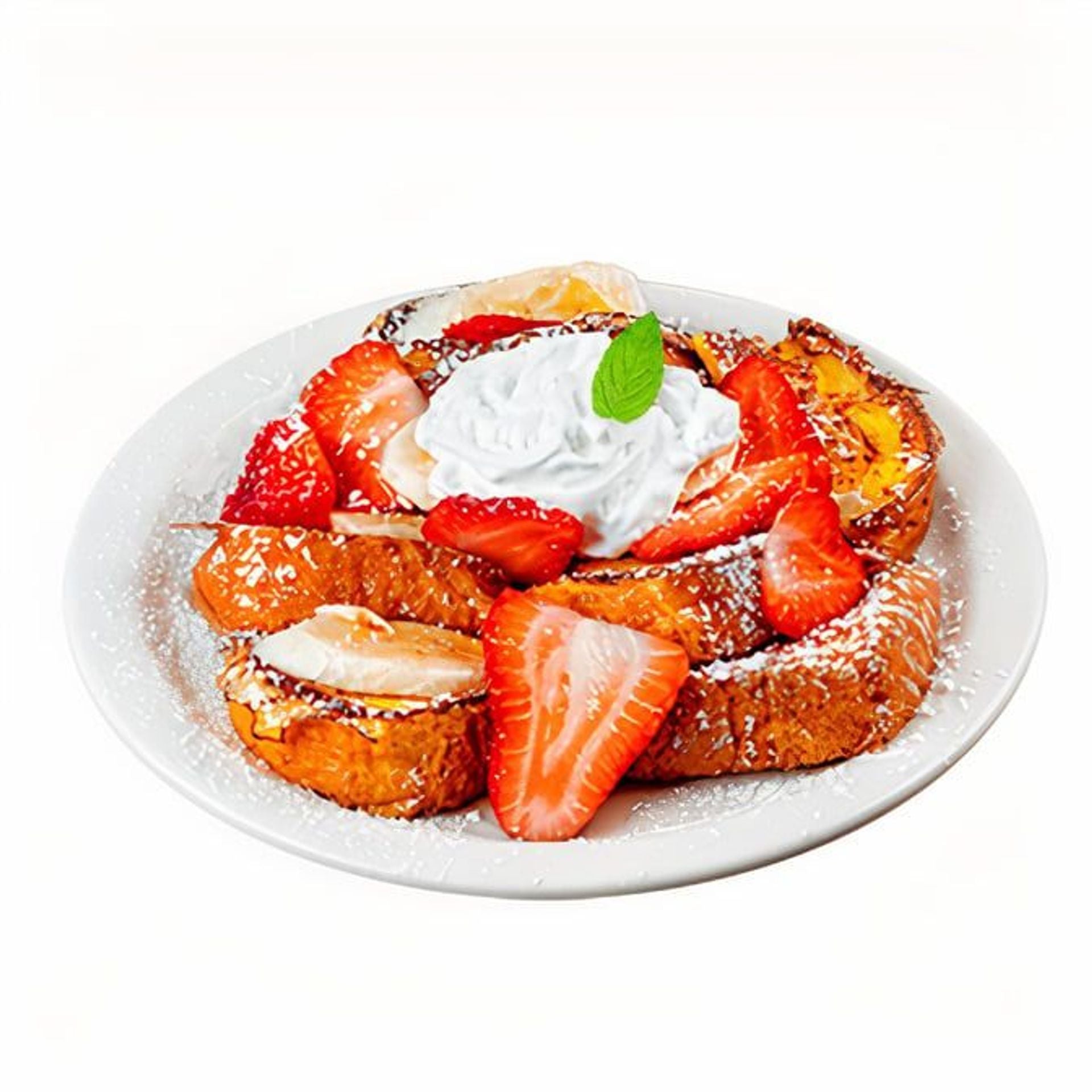 Fresh strawberry slices, banana slice. Topped with powdered sugar, fresh whipped cream & a mint leaf.