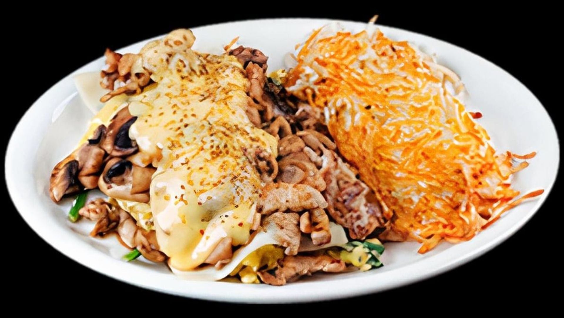 2 scrambled eggs mixed with green bell pepper & onions. Topped with spinach, swiss cheese, chicken breast strips, mushrooms & hollandaise sauce finished with seasoned salt. Served with hashbrowns.